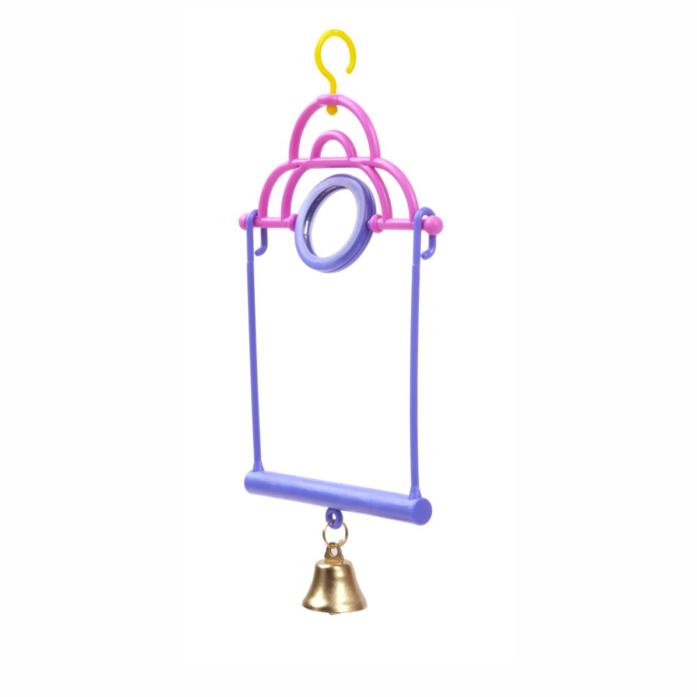 Farebná plastová hojdačka so zrkadielkom a zvončekom na zavesenie do klietky – podporuje pohyb, zvedavosť a prirodzené správanie vtákov.